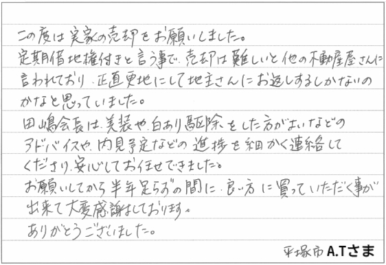 当初はとても無理では...と思っていた古家の売却をコロナ禍で大変な状況の中、依頼してから5ヶ月という早さで売却できたのはひとえに迅速かつ親切丁寧な対応をして下さった田嶋会長のお陰と心より感謝しております。