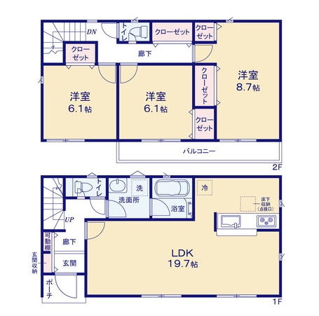 特色 | 準防火、公営水道、公共下水、東京電力、プロパン、駐車場、対面キッチン、システムキッチン(浄水器一体型水栓)、床下収納、シャワードレッサー、浴室乾燥機、1坪バス、オートバス、シャワートイレ1F/2F、人感センサー付玄関灯、TVモニター付インターホン、ピッキング対策付玄関ドア、複層ガラス、階段手摺、24時間換気、全居室南向き、フラット35S、制震装置、住宅性能評価取得 | ||