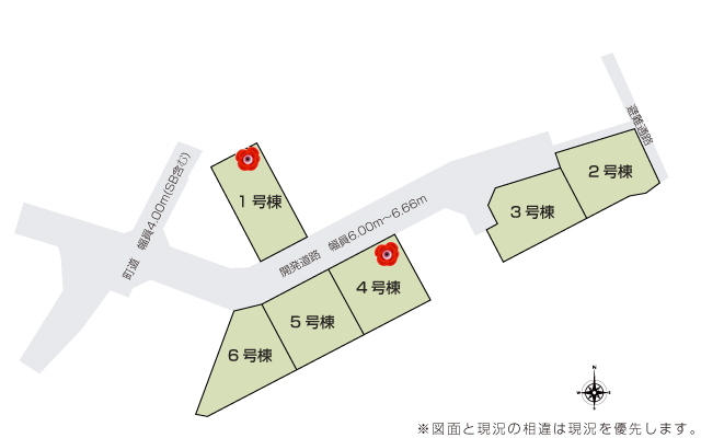 | 接道 | 北 6m(幅員) 西 4m(幅員) |