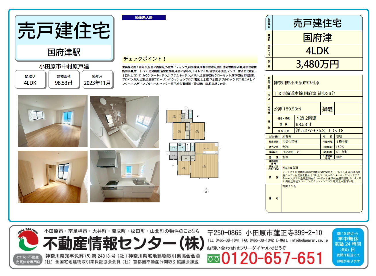 小田原市中村原、2023年11月築の未入居戸建てのご紹介です。LDKをはじめ各居室が2面採光のため、明るい日差しが差し込み、室内は一日を通して心地よい空間が広がります。
