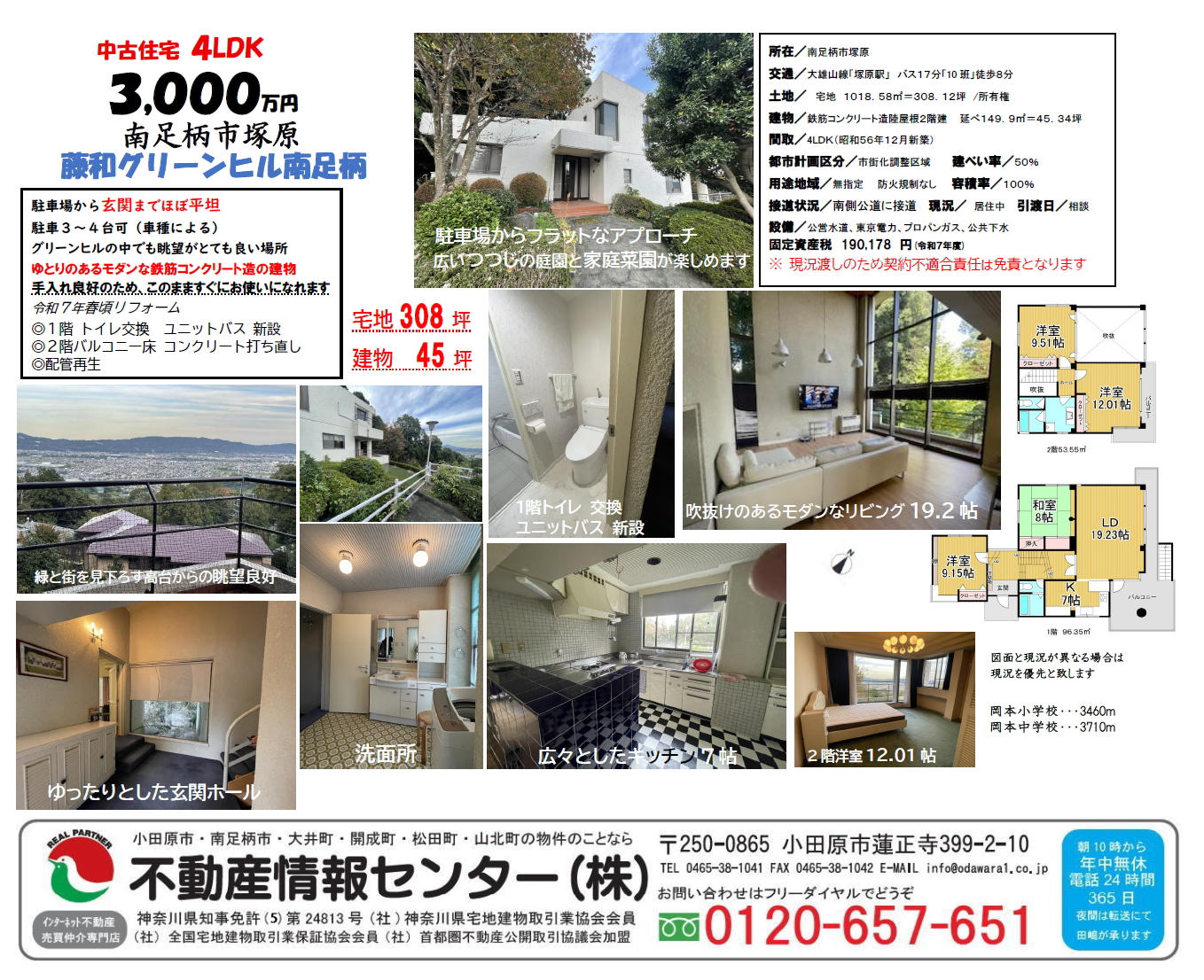 南足柄市塚原・グリーンヒル分譲地内の中古戸建て、自然豊かなグリーンヒル分譲地の中でも、特に眺望に恵まれた高台に位置する、308坪のゆったり敷地を誇る一戸建てです。