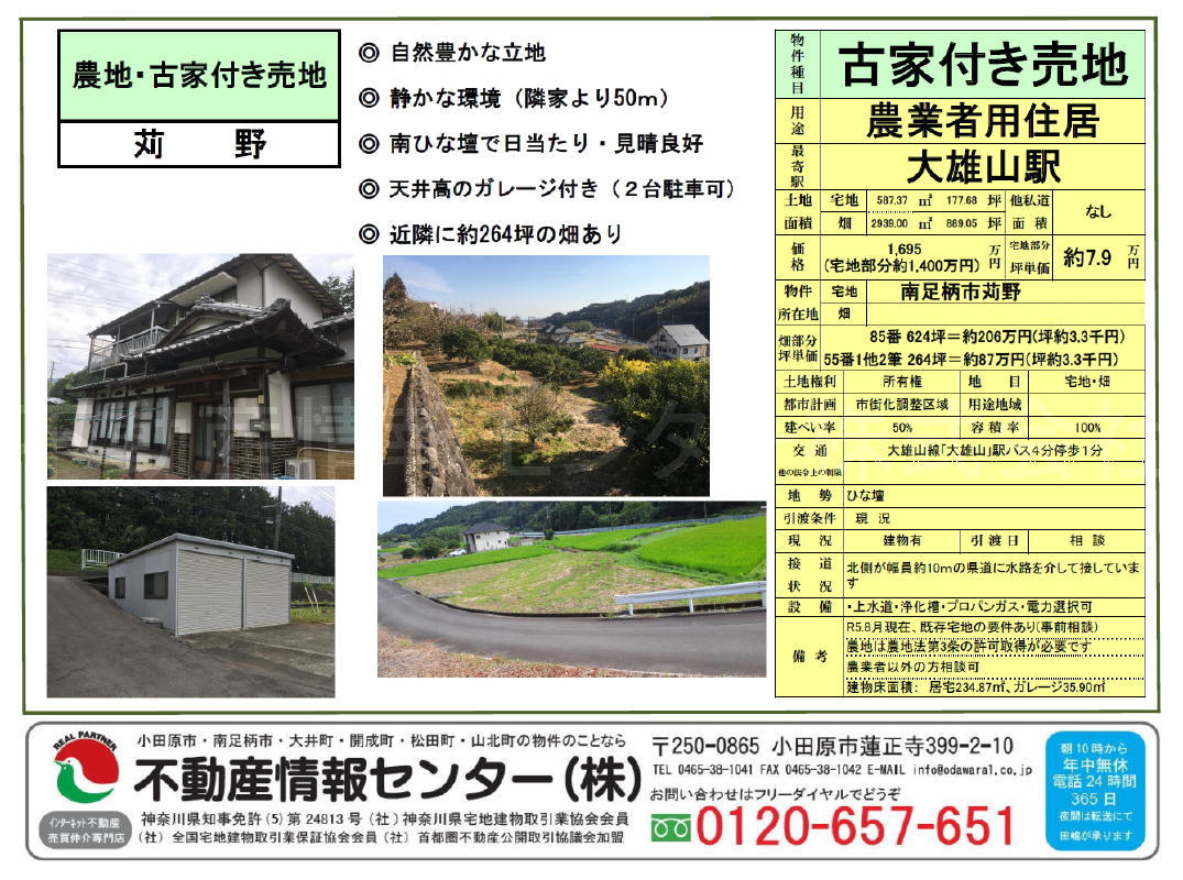 南足柄市苅野に位置する、自然豊かな環境に囲まれた農業者向け古家付き農地です。