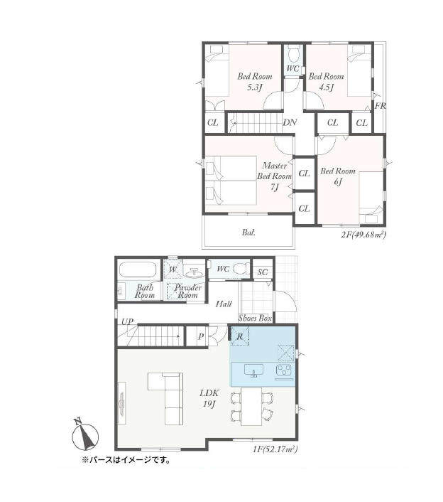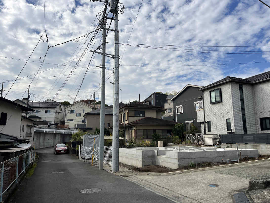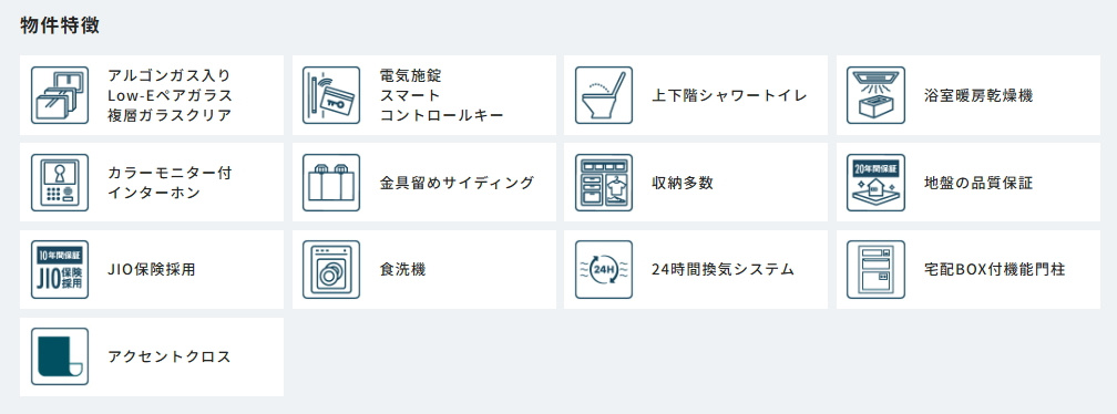 | 特色 | 公営水道、公共下水、東京電力、都市ガス、駐車場、駐車場3台以上可、フラット35S、システムキッチン(浄水器一体型水栓)、対面キッチン、食洗機、24時間換気、浴室乾燥機、1坪バス、オートバス、TVモニター付インターホン、階段手摺、シャワートイレ1F/2F、パントリー、角地、日当たり良好、シューズインクローゼット |