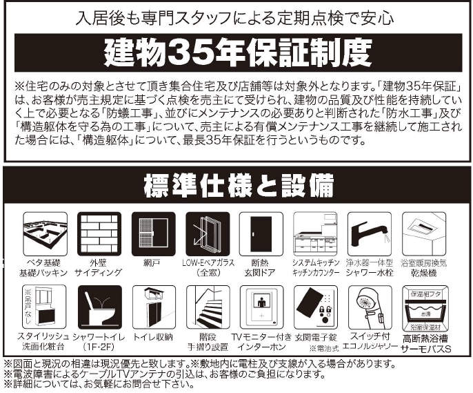 | 特色 | 公営水道、公共下水、東京電力、都市ガス、駐車場、対面キッチン、システムキッチン(浄水器一体型水栓)、パントリー、カップボードダウンウォール、1坪バス、オートバス、複層ガラス、階段手摺、TVモニター付インターホン、浴室乾燥機、全居室南向き、カードキー |