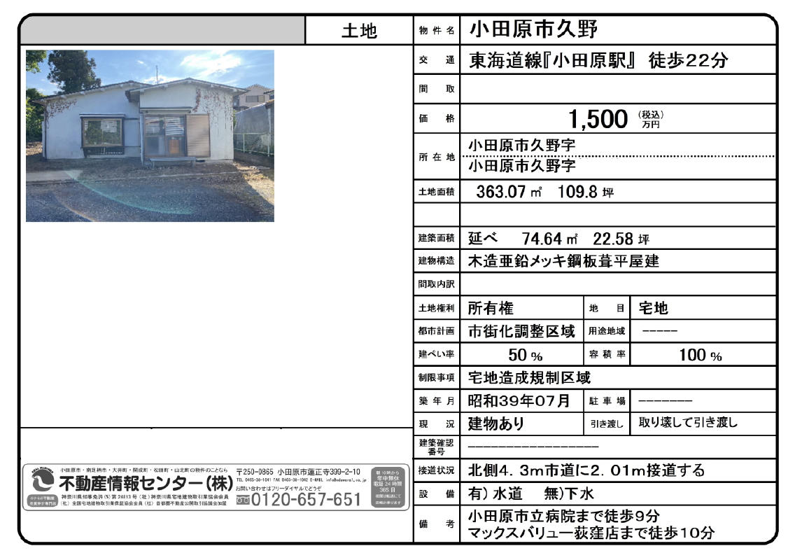 小田原市久野、上物有りの売地、敷地面積は109.82坪です。建物は、1964年昭和39年7月築、74.64㎡の建物です。