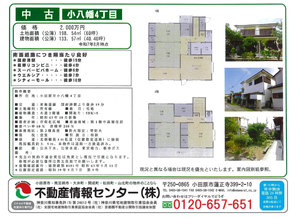 敷地面積約60.05坪とゆとりのある広さを持ち、落ち着いた住環境の中でのびのびと暮らせる小田原市小八幡の中古戸建てです。