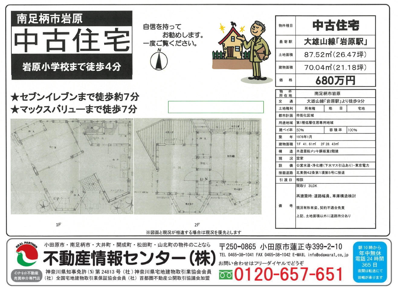 大雄山線岩原駅より徒歩9分の立地にある、1976年築の3LDK中古戸建て。敷地内には普通車1台分の駐車スペースがあり、車通勤の方にもおすすめ。土地面積に加えて、前面道路の持ち分があります。