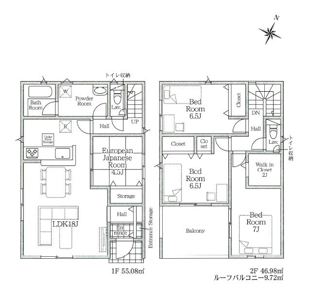 特色 | 公営水道、公共下水、東京電力、プロパン、駐車場、対面キッチン、システムキッチン(浄水器一体型水栓)、床下収納、シャワードレッサー、1坪バス、オートバス、シャワートイレ1F/2F、人感センサー付玄関灯、ウォークインクローゼット、TVモニター付インターホン、ピッキング対策付玄関ドア、複層ガラス、階段手摺、24時間換気、フラット35S、制震装置、住宅性能評価取得 |