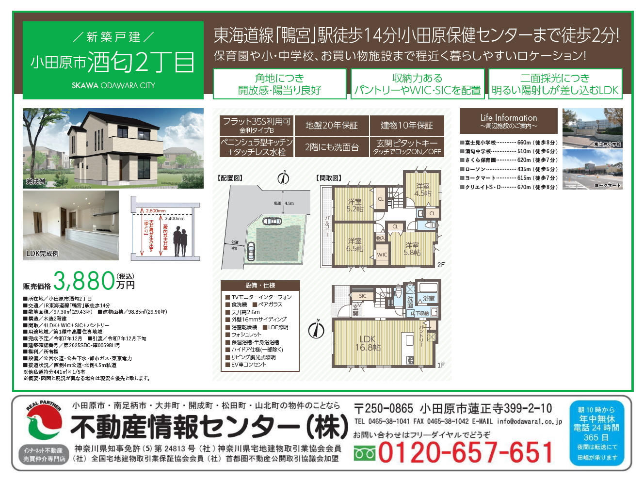 小田原市酒匂2丁目に位置する新築一戸建てのご紹介です。角地に建つ本物件は、日当たり・風通しともに良好で、明るく開放感のある住まいとなっております。