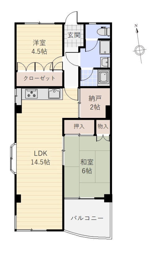 1985年築の味わいを活かしながら、リノベーションのご相談も可能です。現況は2LDK+2帖の納戸付き。間取りを変更して、既存LDKと和室を一体化すれば、約20.5帖の広々としたLDK空間を実現できます。
