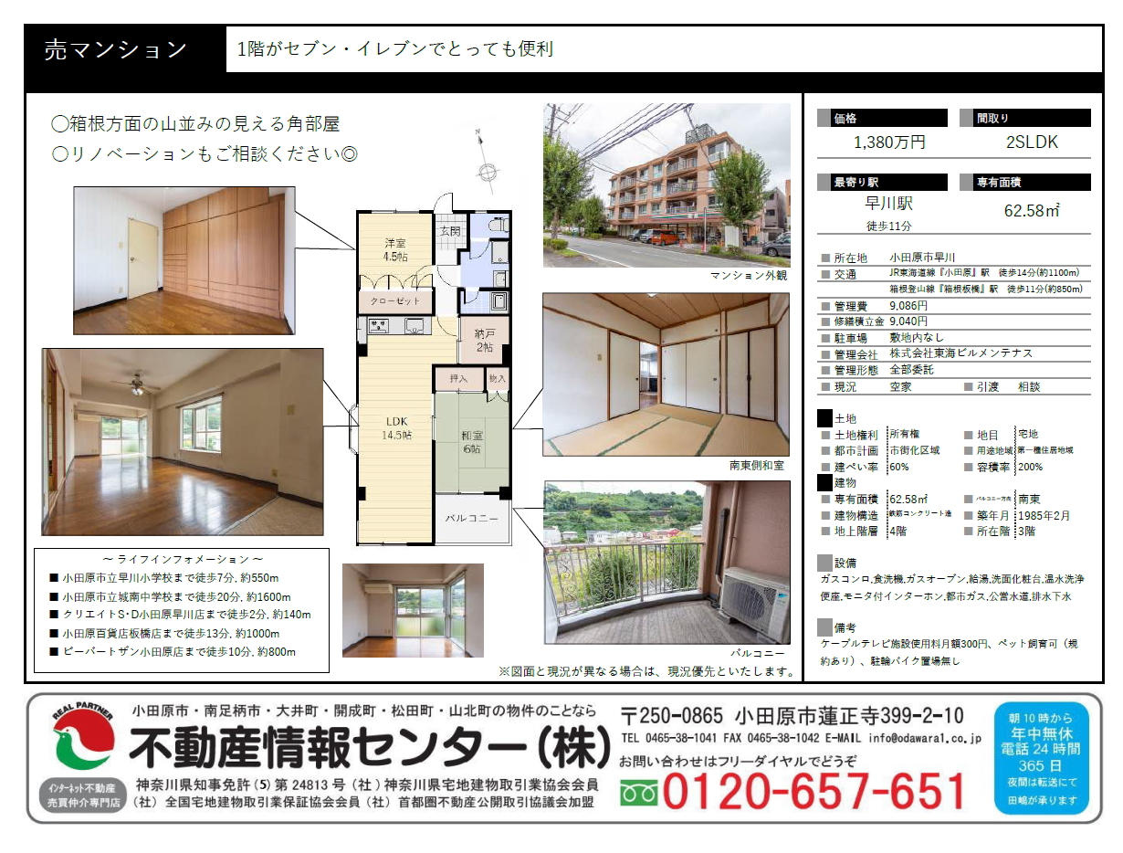 小田原市早川3丁目 共立早川マンション。箱根方面の山並みを望む、ゆとりのある南東角部屋3階のお部屋です。