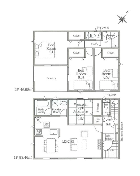 | 特色 | 公営水道、公共下水、東京電力、プロパン、駐車場、駐車場3台以上可、対面キッチン、システムキッチン(浄水器一体型水栓)、床下収納、シャワードレッサー、浴室乾燥機、1坪バス、オートバス、シャワートイレ1F/2F、人感センサー付玄関灯、TVモニター付インターホン、ピッキング対策付玄関ドア、複層ガラス、階段手摺、24時間換気、フラット35S、制震装置、住宅性能評価取得 |