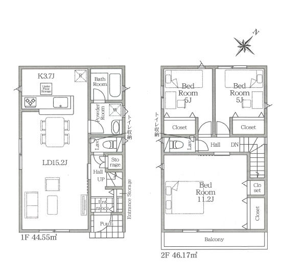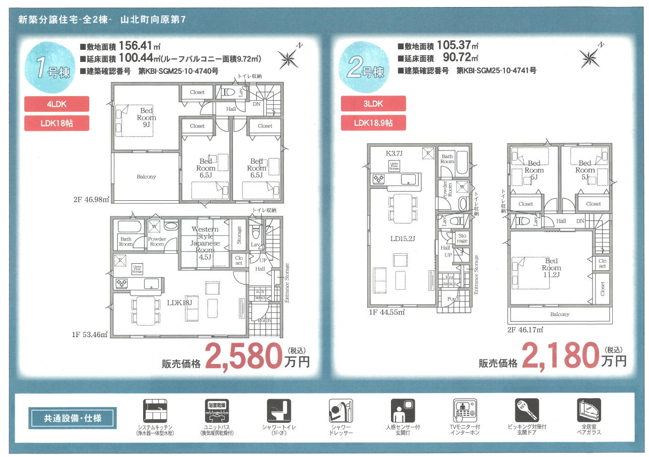 | 特色 | 公営水道、公共下水、東京電力、プロパン、駐車場、対面キッチン、システムキッチン(浄水器一体型水栓)、床下収納、シャワードレッサー、浴室乾燥機、1坪バス、オートバス、シャワートイレ1F/2F、人感センサー付玄関灯、TVモニター付インターホン、ピッキング対策付玄関ドア、複層ガラス、階段手摺、24時間換気、フラット35S、制震装置、住宅性能評価取得 |