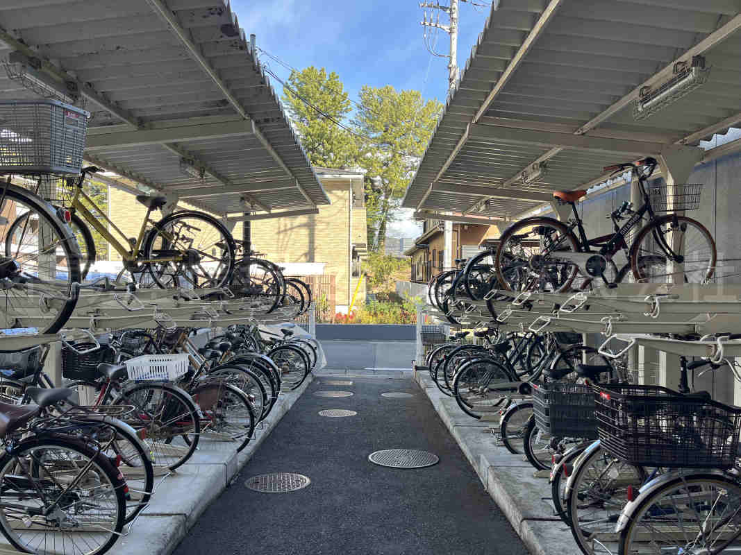 現在駐車場は2台契約中(1台4000円/月)、機械式駐車場の地上側に1台、地下に1台使用しています。駐輪場に関しても2台契約中(1台200円/月)、いずれも引き継いでの使用が可能です。防犯カメラ、光ファイバー完備されています。