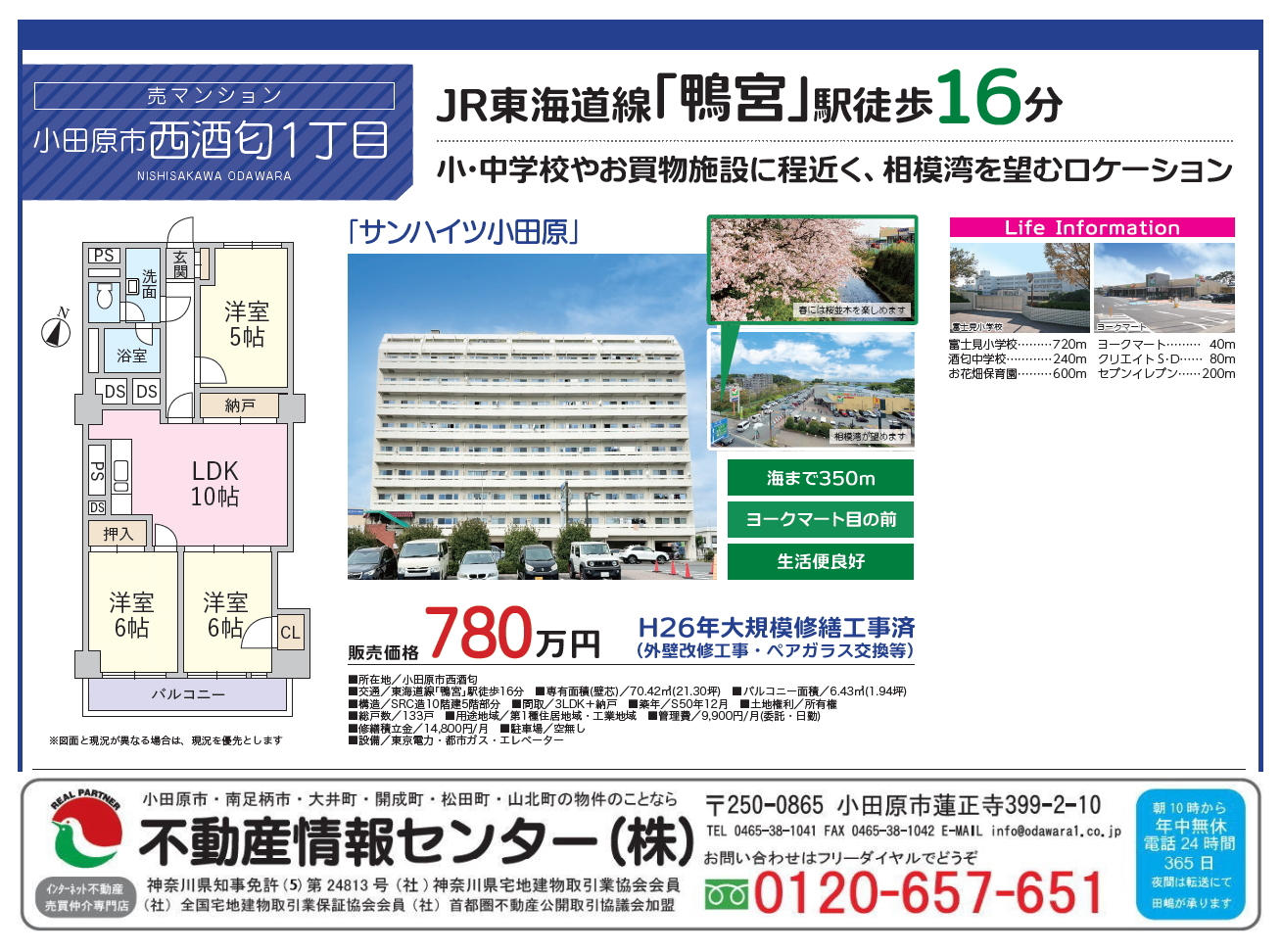 小田原市の売マンション サンハイツ小田原 5階のお部屋です。JR東海道線「鴨宮」駅まで徒歩16分の立地、穏やかな住環境と利便性を兼ね備えた、小田原市西酒匂エリアのマンションです。