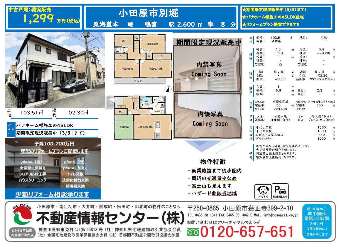 小田原市別堀の閑静な住宅街に、大手ハウスメーカーであるパナホーム施工の軽量鉄骨造・4SLDKが登場しました。 毎日のお買い物に便利な「ロピア小田原高田店」までは徒歩7分(約550m)、さらに多彩な専門店が揃うショッピングモール「ダイナシティ」へも徒歩13分(約1000m)と、日常の用事がすべて徒歩圏内で完結する贅沢な住環境です。また、コンビニエンスストア「セブンイレブン小田原別堀店」徒歩2分(約130m)の距離にあり、急な入り用にも困りません。 周辺は交通量が少なく、小さなお子様のいるご家庭や静かな環境を求める方にも最適です。さらに、天気の良い日には美しい遠方には山々や富士山も見え 日々の暮らしに四季折々の彩りを添えてくれます。また、ハザードマップ非該当地域に位置しており、長く安心して住み続けられる場所をお探しの方にとって、大きな安心材料となるでしょう。 建物については、シロアリ防除工事や雨漏り・設備点検を実施予定です。雨漏り、構造上主要な部分の欠陥や・腐食、給排水管の故障や漏水についてお引渡しより2年間保証、シロアリ防除工事施工後5年間保証も付帯しており、中古住宅に対する不安を解消する体制を整えています。さらに、新品の照明器具設置予定なので入居後にすぐに生活が始められます。 2026年3月31日までは「現況販売」期間となっております。「自分の手で少しずつリフォームを楽しみたい」「コストを抑えて購入したい」というお客様にとっては、4月1日からのリフォーム販売開始前の今が、最も自由度の高い検討タイミングです。もちろん、ちょっとしたクロスの張り替えや設備交換など、少額リフォームのご相談も随時承っております。 資金計画に関しても、本物件は条件により住宅ローン減税の適用が可能です。初めてのマイホーム購入で不安を感じている方も、お客様一人ひとりに合わせた最適な金融機関やローンの組み方をご提案いたしますので、どうぞお気軽にご相談ください。利便性、安心、そして将来のカスタマイズ性。すべてを兼ね備えたこの住まいで、新しい一歩を踏み出してみませんか。 ※防火22条区域(建築基準法第22条指定区域)