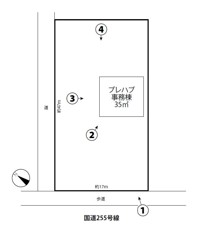 ・土地面積: 234.52坪(775.27㎡)・建物: プレハブ事務所(約10.5坪)あり