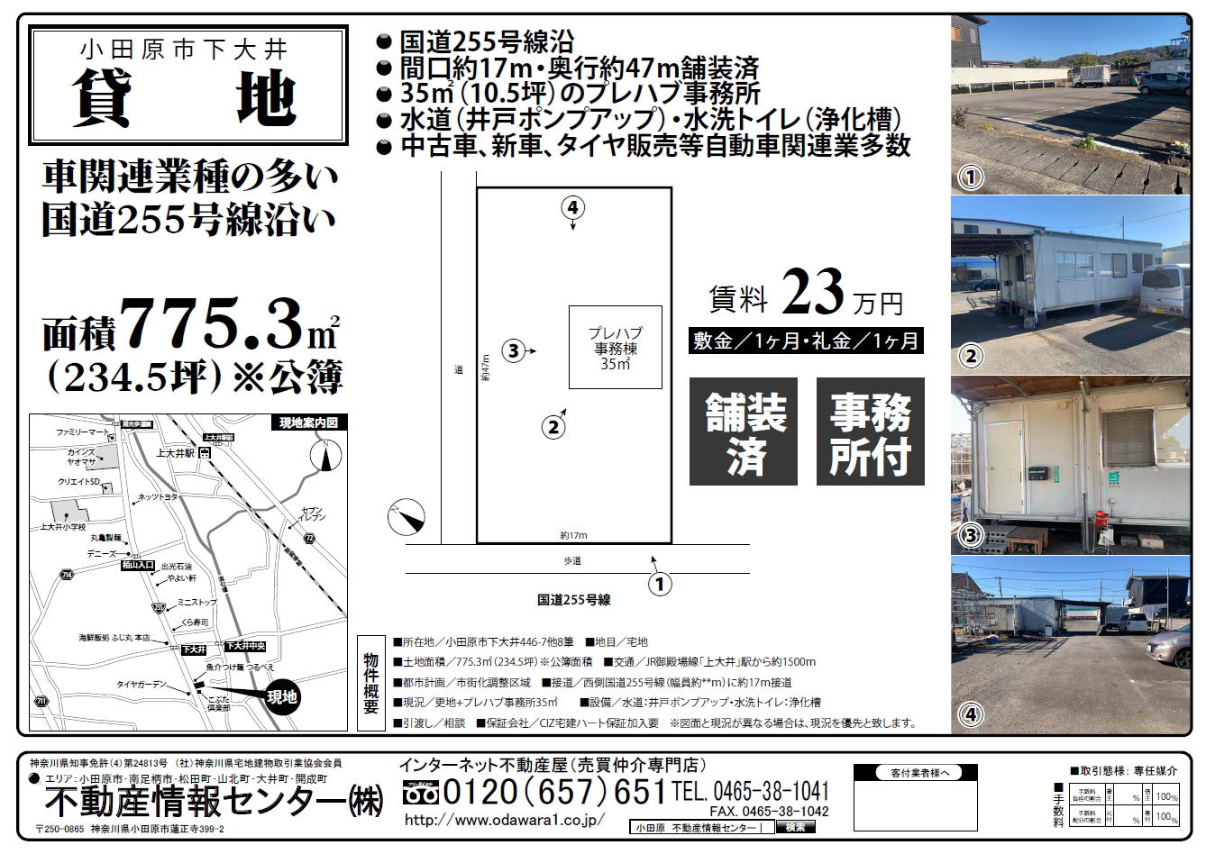 小田原市下大井、商業施設が軒を連ねる国道255号線沿いに、約234坪の事業用貸地が登場しました。舗装済みで、約10.5坪のプレハブ事務所がついており、電気・水道・水洗トイレが完備。契約後スムーズに営業を開始できる環境が整っています。