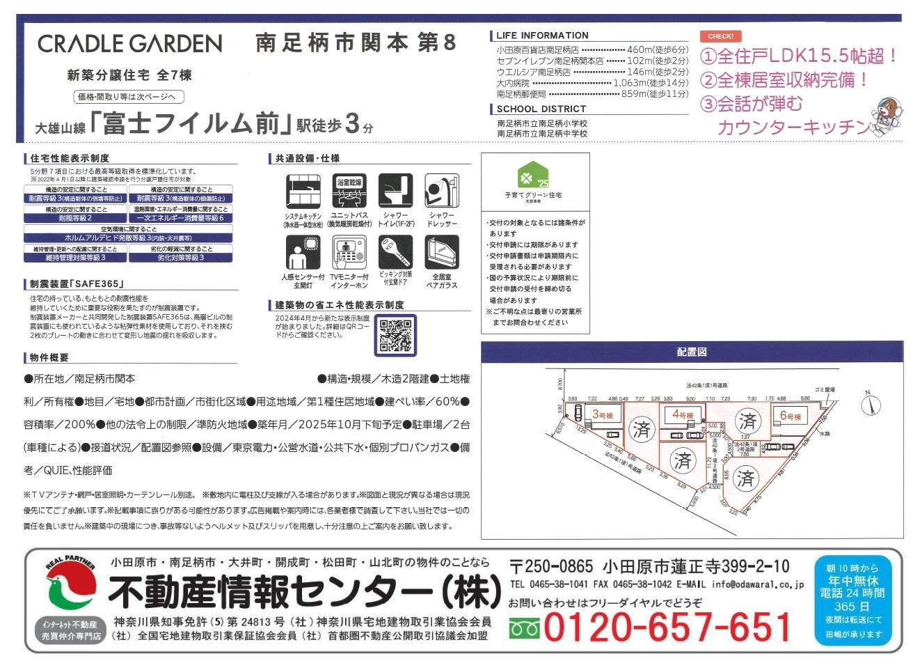 | コメント | 駅徒歩3分×生活便利×充実設備!自然も感じられる理想の新築戸建てのご紹介です。 大雄山線「富士フイルム前」駅まで徒歩3分、「大雄山」駅までも徒歩7分と、通勤・通学に便利な立地に誕生した南足柄市関本の新築一戸建て(3LDK)。小田急線「新松田」駅へはバスで約17分と、複数路線へのアクセスも可能で、日々の移動がスムーズです。 住宅は【設計・建設住宅性能評価取得済み】【フラット35S対応】【制震装置付き】と安心の仕様。準防火地域に建てられており、構造・安全面でも高い基準をクリアしています。全居室南向きで明るく、窓からは山々の自然も望める穏やかな住環境です。 さらに、収納力に優れたパントリーも完備。日々の家事効率を高め、スッキリとした空間を保てます。 周辺環境も充実しており、目の前にはウェルシア・はま寿司・セブンイレブンがあり、徒歩7分の「大雄山」駅周辺には商業施設「ヴェルミ」が。スーパー、飲食店、クリニックなどが揃い、日常生活にも便利な立地です。 自然と利便性を兼ね備えたこのエリアで、安心・快適な新生活を始めてみませんか? |