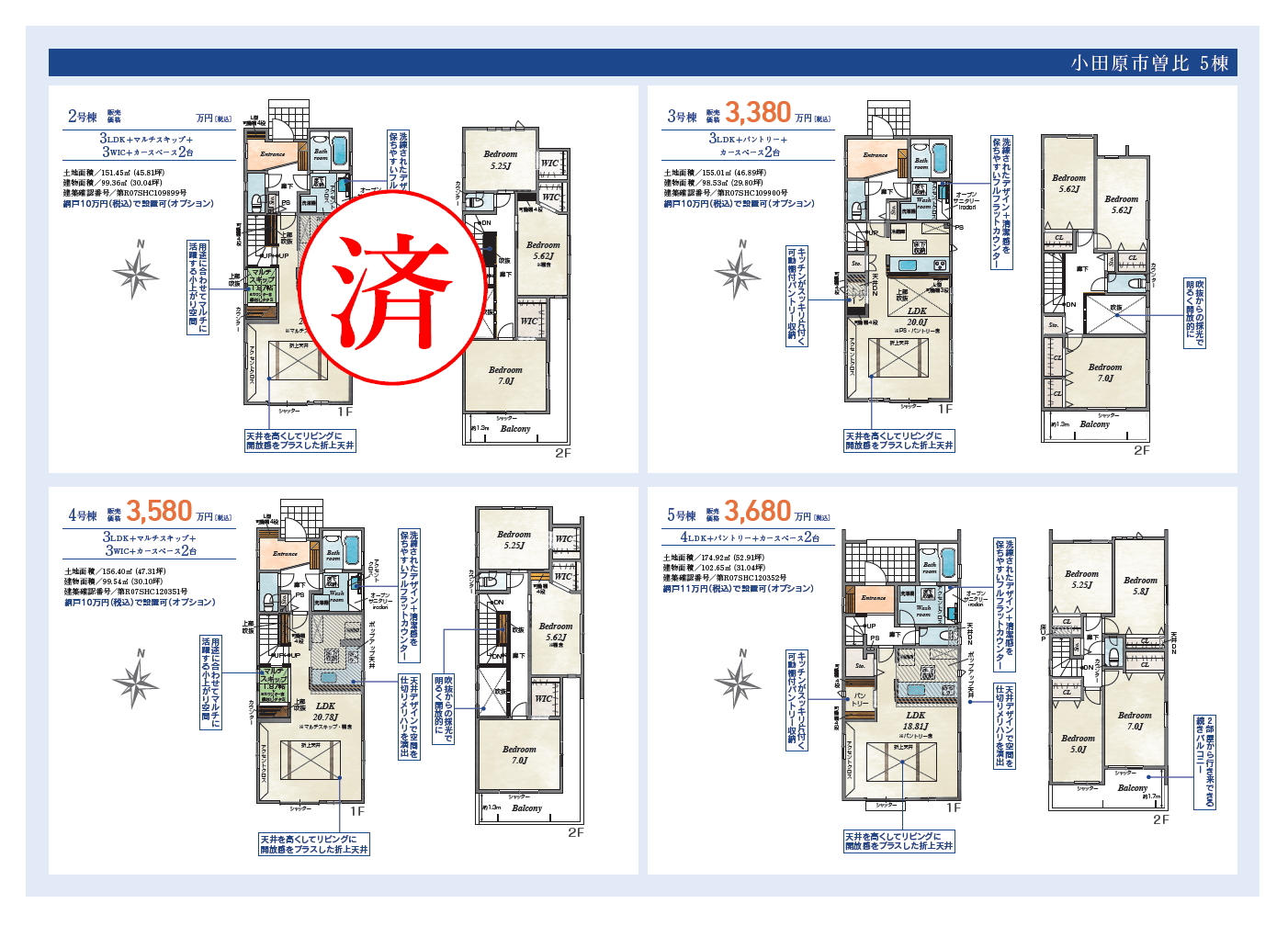 | 特色 | 準防火、公営水道、公共下水、東京電力、プロパン、駐車場、シャワートイレ1F/2F、床下収納、パントリー、対面キッチン、システムキッチン(浄水器一体型水栓)、食洗機、1坪バス、オートバス、人感センサー付玄関灯、TVモニター付インターホン、ピッキング対策付玄関ドア、複層ガラス、24時間換気、フラット35S、住宅性能評価取得 | |||||||||||||||||