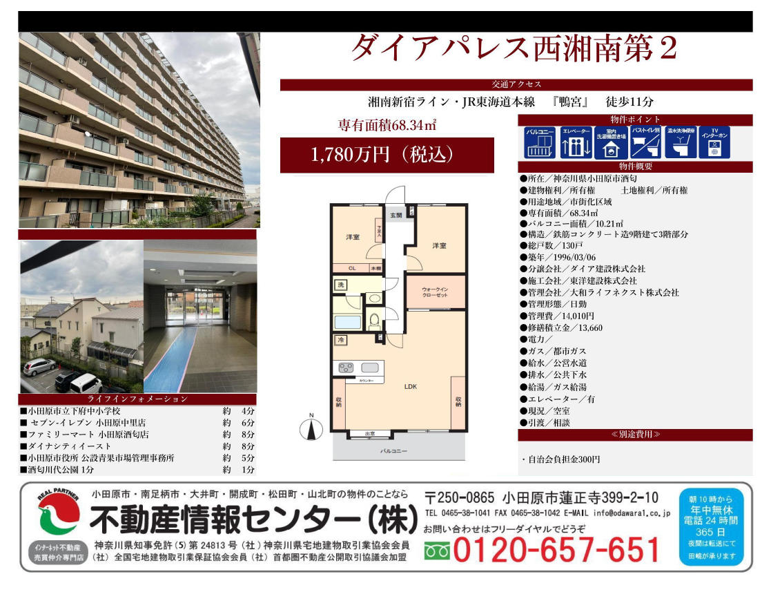 小田原市酒匂に佇む「ダイアパレス西湘南第2」は、利便性と自然環境のバランスが取れた住みやすいエリアに位置するマンションです。 9階建ての3階部分で、南向きのバルコニーからたっぷりと陽の光が差し込み、室内を明るく温かな空間に保ちます。2LDKの間取りに加え、ウォークインクローゼットを備えており、収納スペースも充実。すっきりとした暮らしを叶えます。 玄関を出ると、天気の良い日には富士山を望むことができ、日々の暮らしの中に自然の美しさを感じることができます。眺望も開放的で、室内からもゆったりとした時間が流れるような心地よさを味わえるお部屋です。 周辺には百貨店や各種ショッピング施設、ホームセンター、飲食店、映画館、温泉施設などが点在し、生活を豊かに彩る環境が整っています。 また、JR東海道本線の鴨宮駅まで徒歩10分と交通アクセスにも優れ、通勤や通学にも便利な立地です。さらに、近隣には幼稚園や保育園、小学校もあり、教育環境も充実しているため、子育て世代のご家族にも安心してお住まいいただけます。 利便性と自然の潤い、そして穏やかな暮らしが共存するこの住まいで、新しい生活を始めてみませんか。 |