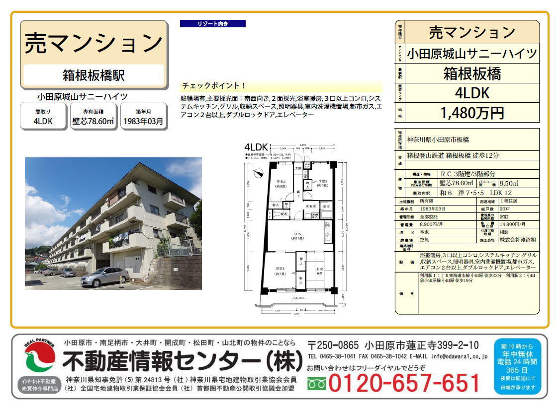 小田原市板橋。歴史と自然が調和するこの街の高台に佇む低層マンション「小田原城山サニーハイツ1号棟」の3階住戸をご紹介いたします。こちらのお部屋の魅力は、窓の外に広がる圧倒的なダイナミックビューです。目の前に広がる穏やかな海の青と、四季折々の表情を見せる雄大な箱根連山。高台ならではの開放感が、日常の喧騒を忘れさせてくれる贅沢な癒しのひとときを約束します。 交通アクセスは、箱根登山線板橋駅徒歩12分、小田原駅よりバス乗車7分・最寄りバス停「城山四丁目」より徒歩2分。県内有数のターミナル駅である「小田原」駅へとスムーズに繋がります。小田原駅からは東海道新幹線を利用すれば東京駅まで約33分。都心への通勤も、週末のレジャーも軽快にこなせる、オンとオフを賢く使い分ける暮らしが叶います。 また、こちらのマンションは大切な家族の一員であるワンちゃんやネコちゃんと一緒に暮らせる「ペット飼育可能」な住まいです(細則あり)。海と山、そして豊かな緑に恵まれた周辺環境は、ペットとの散歩コースとしても最適で、心豊かな毎日を共にお過ごしいただけます。 小田原の豊かな自然を五感で感じ、利便性も手放さない。そんな理想的なライフスタイルを、この眺望自慢の邸宅から始めてみませんか。高台の静寂と開放感に包まれた、ゆとりある暮らしをぜひ現地でご体感ください。 |