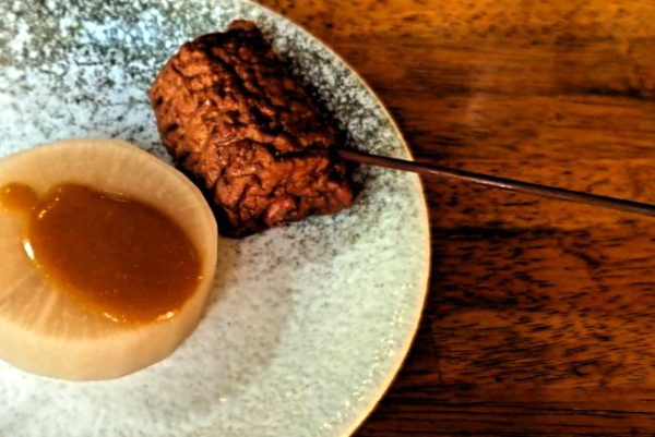 山の中現れたるは、古き良き雰囲気が漂う古民家。もうこれだけ気分が上がってしまいますね。メニューは「湯うどん」「ザルうどん」「とろろうどん」「カレーうどん」など、そして「各種おでん」があります。私は以前から大好きな湯うどんをチョイス。そしておうどんが出来上がるまでおでんをいただくことにします。こちらのおでんはセルフで取りに行って、最後に串の数を報告してお支払いをします。お腹が減っている状態なので、油断をするとぼんぼんとおでんを食べてしまいそうになり危険です。自制心を高めて、おでんは「だいこん」と「さつまあげ」の二本だけいただきます(我慢、我慢)それにしても、味が染み染みで美味しい~!(*^ω^*)